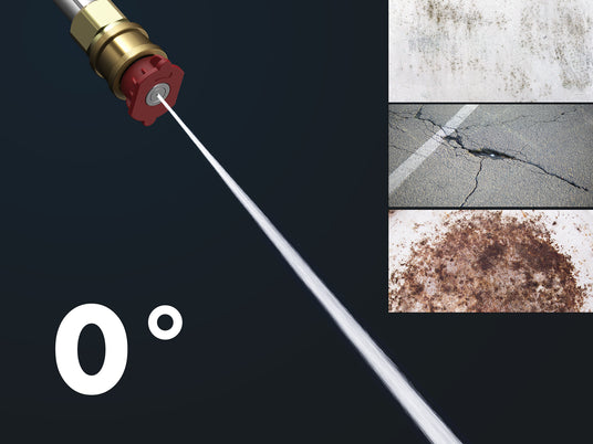The 0° high-pressure nozzle delivers a concentrated stream of water, perfect for blasting away tough stains and grease on vehicles, exterior walls, and more.
